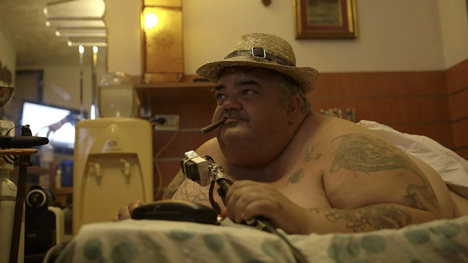 L’Oreto, il fiume ormai ridotto a poco più che un rigagnolo, metafora eloquente dell’incuria e del senso di abbandono che pervade la città, i suoi abitanti e le sue strade. Giuseppe Schillaci, che da molti anni vive in Francia, ha un interlocutore privilegiato nei suoi ritorni a Palermo: si chiama Salvatore Spatola, ma tutti lo chiamano Sergio. Pesa più di 250 kg, fa il tatuatore. E abita a Bosco Grande. Una zona non intaccata dai flussi turistici, che non compare in nessuna mappa della città; un nome fiabesco che potrebbe rievocare una storica villa settecentesca in cui Visconti girò parte del suo Gattopardo – ma che si trova in tutt’altra parte della città – o più prosaicamente un’antica pasticceria, residuo da poco estinto di un evidente passato. Una delle caratteristiche della città che in questo film si racconta è quella di reinventarsi costantemente già a partire dai nomi: degli abitanti, delle strade, spesso chiamati in modi diversi da quelli ufficiali. Via Boscogrande non esiste più, ma in questi termini ancora alcuni si riferiscono alla via (Marconi) e per estensione al quartiere in cui vive e lavora Salvatore, che tutti chiamano Sergio.