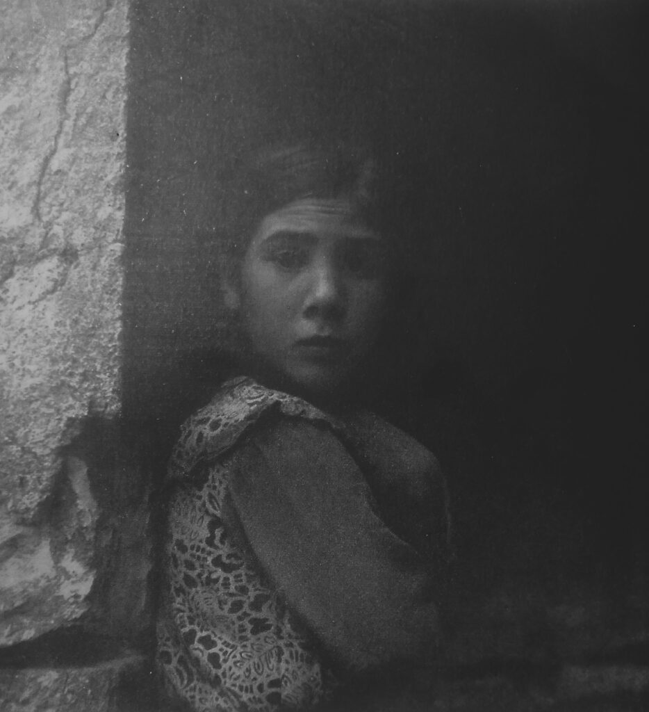 «Moglie-bambina in un sobborgo di Catania», così recita la laconica didascalia a pagina 21 dell’edizione illustrata di Conversazione in Sicilia. L’immagine mostra un ritratto quasi annegato negli scuri di uno sfondo imprecisato dove si cela presumibilmente l’abitazione della bambina. Che forse non è nemmeno una bambina ma è una ragazza, o forse già una donna. Impossibile decifrarne l’età, che appare comunque giovanissima nonostante il pentagramma di rughe che ne scava la fronte, segno indubitabile di una vita breve ma già segnata dalla fatica. Il muro sbreccato che fa da cornice alla foto ricalca il senso di una fatica che subiscono anche le pietre. La bambina guarda dritta nell’obiettivo, senza sorrisi, senza sfide, senza patetismi, solo con una debole curiosità, come a chiedersi che mai potranno volere da lei e quando se ne andranno questi visitatori.